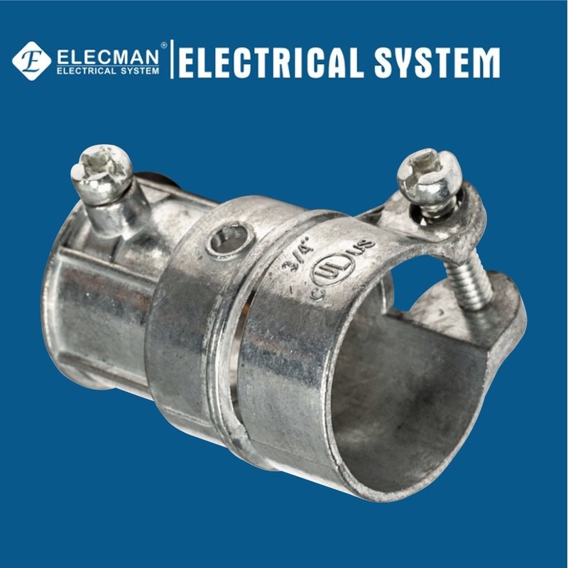 ELECMAN, 1/2"EMT-3/8"FMC'den 1"EMT-1"FMC'ye kadar tam boyutlu çinko döküm EMT'den FMC'ye kombinasyon kaplinleri sıkma tipi sağlar.